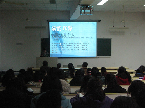 大会伊始,主持人向大一的同学介绍了暑期实践活动的要求和任务,以便同学们了解暑期实践活动的重要性。紧接着,永利yl23411官网员工会主席陈辉向大家做了2010年暑期社会实践成果总结。然后,大会进入高潮阶段--颁奖典礼。这些奖项分别是:优秀实践基地、优秀实践团队和实践优秀个人。其中永利yl23411官网“探寻泰顺特色文化”暑期社会实践队、永利yl23411官网“点燃希望,放飞梦想”暑期社会实践队和永利yl23411官网“探究温州民企社会责任慈善助学模式调研”暑期社会实践队荣获了2010年温州市大中专员工暑期社会实践活动“优秀团队”的称号。然后,永利yl23411官网入口实践中心负责人张建增为大一同学做了2011年暑期社会实践活动方案指导,意在让大家对社会实践活动有更加明确的了解。随后,麻老师对暑期实践活动做了进一步的总结。麻老师指出“受教育,长才干,做贡献”是我们举行这个活动的主要目的。他还通过老员工为留守儿童和农民工子弟补课等例子生动地为大家讲解了实践活动对员工和社会的意义。最后,荣获“优秀团队”称号实践队的队长罗倩倩和沈芳展示了各自团队在暑期实践活动中的风采。