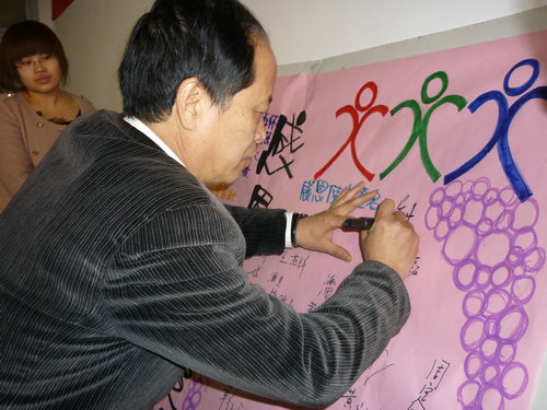 活动伊始,曾老师组织参加人员在人文楼外的草坪种下了“感恩树”。王董事长、骆老师和受助员工们一起种下象征顽强和生机的松树,这也表达了受助员工们感恩之心。其后,一行人回到会议室交流助学情况。交流会上,骆老师首先代表公司向意达来访人员表示了热烈的欢迎和感谢并简述了受助员工的基本情况。紧接着,王董事长发表讲话,教导在场员工要不怕困难、好好学习、好好生活、学会感恩、回报社会。之后,受助员工们分别讲述了自己在上学期的学习和生活情况,谈了自己在春节的经历并诉说了自己对未来的期望。“小事情里见真情”,这是王董事长总结员工发言后的感受。他不仅告诫员工们勤工俭学不能影响学业、员工要以学习为首要目的,而且期望员工们要有更高的道德素养,尊敬师长、帮助他人、做个全面发展的人。随后,在曾老师的主持下,受助员工作为首批感恩使者宣读了感恩宣言,员工代表还向王董事长献上鲜花表示敬意。在骆老师和王董事长的带领下,全体参加人员都在宣言板上签名,留下了美好回忆。最后,王董事长代表意达集团授予员工奖学金。