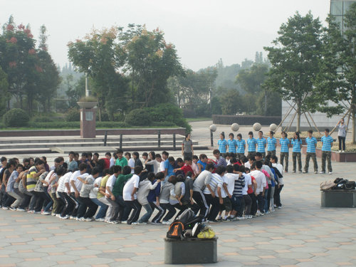 此次活动由素拓部组织举行,旨在锻炼团委员工会新成员的沟通、协作能力。在活动一开始,参加活动的所有人员被分成六队,每队都分配有一个培训师。第一个环节为"破冰",即以小队为单位各个成员作自我介绍,选出队长之后合作商讨各自的队名、队歌、队形、口号,最后以海报形式分别展出。第二个环节为每个参加成员都带戴上了眼罩,在培训师的带领下手挽手走路,找到地面上的绳子,扎起来围成最大的矩形。第三个环节为"坦克转转"用报纸粘成履带,队员们配合向前走。现场大家团结协作,氛围高涨。