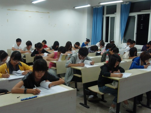 晚上18点40分,大一新生在员工会的组织下进入考场,考试正式开始。负责监考的是团委员工会的员工干部们。考场内秩序井然。同学们态度端正、神情严肃,考场内秩序井然,十分安静。20点10分左右,考试基本结束。