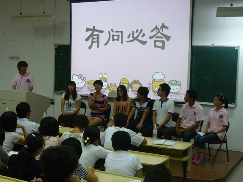 首先,主持人以一段视频揭开了交流会的序幕,向同学们展示了人文团学所开展的丰富多彩的活动。接下来,麻老师在讲话中对新生们提出了几点颇有教益的建议。而后,有趣的小游戏迅速调动起了现场的气氛。之后,几十张珍贵的照片以学习、工作、创业三个主题勾起了新生们对老员工活的无限憧憬。最后,进入"有问必答"环节。七位大三大四的学长学姐坐到台前,为新同学们一一解答对于老员工活的疑问。