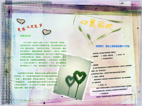 心理小贴士画报是由心理部干事以及各班心理委员共同支持参与制作的,运用心理小故事、心理电影、心理测试等小贴士的形式,分别张贴在员工公寓宣传栏以及公司心语轩宣传窗内,供公司广老员工观看,从而达到了宣传心理健康、发扬人文关怀的主旨。