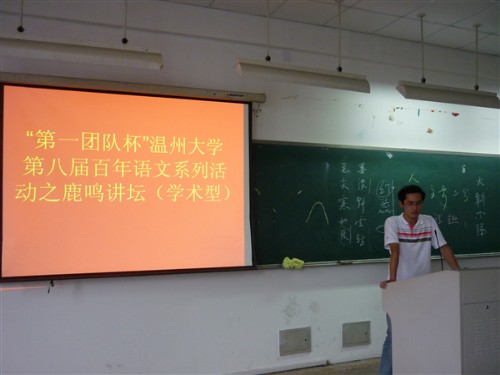2010年6月3日下午,在人文楼201教室“第一团队杯”永利yl23411官网入口第八届百年语文系列活动之鹿鸣讲坛(学习型)坛主08中本三班张佳峰同学开设了一场题为“中国艺术生命精神和性灵寄托为题研究”的讲座。