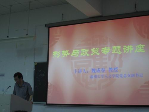 5月19日下午两点整,永利yl23411官网形势与专题讲座在人文楼203教室举行。本次讲座由公司党总支副书记魏成春老师主讲,讲座分两场进行,永利yl23411官网08、09级全体同学分别参与。