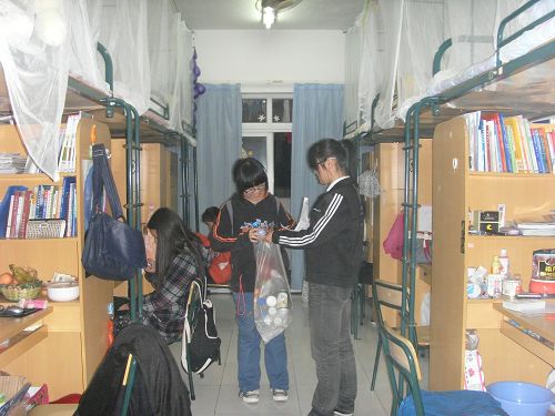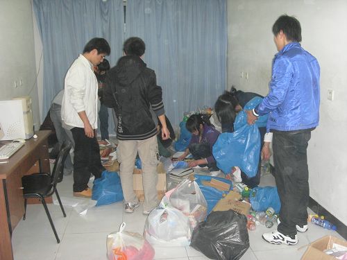 晚上8:50,志愿者们在C区凉亭集合,整装待发。志愿者被分成五组,分别负责C5、C7、C8、C9、C综的宿舍。9点整,宣传废旧物品回收的活动正是开始。志愿者们拿好环保袋,走进每个寝室,努力地宣传,向同学们说明活动的意义及形式。虽然志愿者刚上完自习课,但是大家都不怕辛苦,积极地工作着。在宣传的同时,好多热心的同学就把自己寝室的废旧物品捐了出来,塑料瓶、铝罐、旧台灯、啤酒瓶、废旧报纸、书刊、杂志等等,成果颇丰。由于东西很多很杂必须一类一类的分好,随后志愿者们便将回收的物品进行了整理,浩大的工程在志愿者的努力之下终于完美收工。