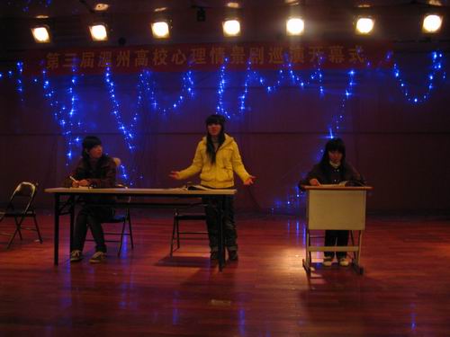 2009年12月19日,第三届温州高校心理情景剧巡演开幕式在北校音乐厅隆重举行,永利yl23411官网代表永利yl23411官网入口参加了心理情景剧巡演第一站。出席本次开幕式的嘉宾有温州科技职业技术公司陈林春老师、心理健康中心主任朱乐微老师、温州广播电视大学吴颖竹老师和永利yl23411官网入口心理健康中心余如英老师。