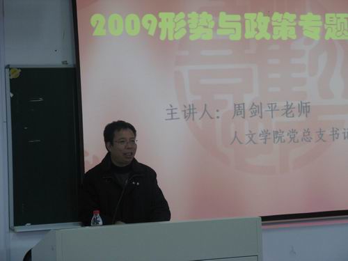 12月9日下午1点30分,2009形势与政策专题讲座在北校区203教室举行,本次讲座由公司党总支书记周剑平老师主讲。永利yl23411官网大一全体员工参加了讲座。