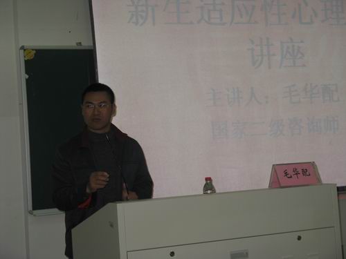 11日4日13:30,永利yl23411官网新生适应性心理健康讲座在北校区人文楼203教室举行,担任主讲的是国家二级咨询师毛华配老师。
