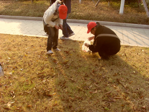 下午3:20,志愿者们从北校出发。首先来到了学子广场。寒风将树叶吹得到处都是。志愿者们便一起将凌乱在道路上的落叶清理到路的两边,围成几堆,还校园一个清洁的面貌。同时将其中各种完整的树叶拾起,为本周三同瓯江公司共同组织的志愿活动准备材料。随后,大家又来到南校图书馆附近。大家卖力地清扫,并细心地从树叶堆中挑选树叶。忙碌了两个小时后,大家拎着收获的叶子,迎着夕阳,结束了本次活动。