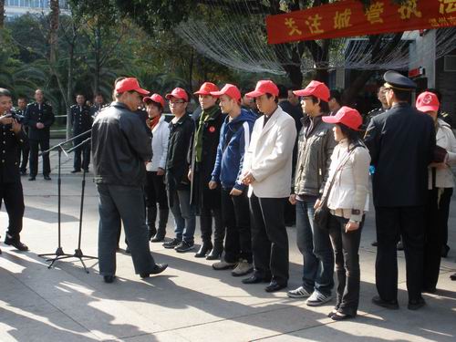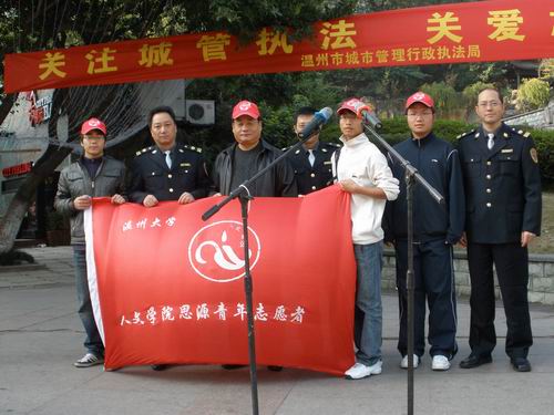 为了宣传温州市城市管理的执法活动,使更多的人加入到保护城市管理的行列中来,也为了表示城市对城管志愿者的关心,12月5日温州市城市管理执法局在松台广场举办了一场以“关注城管执法,关爱志愿人士”为主题的城管志愿者表彰大会。温州市城市管理执法局邀请了鹿城一中队、出租车志愿者协会等志愿者机构450名志愿者,而永利yl23411官网思源志愿者协会也在被邀请之列。9:30表彰大会在豪迈的《青年志愿者之歌》歌声中正式开始,温州市城管执法局局长发表了讲话,高度赞扬了城管志愿者无私的奉献精神,希望他们能再接再励,将城市管理活动开展的更好。接下来永利yl23411官网的城管志愿者戴雅彬同学领唱了《青年志愿者之歌》,全体志愿者也都放声歌唱,表达自己对城管志愿者事业的热爱。歌曲完毕,便开始了对城管志愿者的表彰,永利yl23411官网范辛祥、徐科等十一位同学荣获 “优秀志愿者”称号。