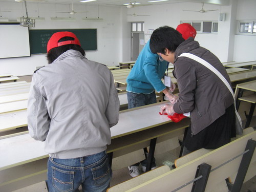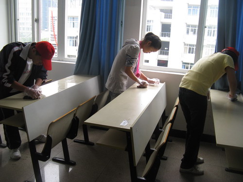 本次活动得到了院领导的大力支持和广大志愿者的积极参与。上午8:30参加本次活动的志愿者在永利yl23411官网集合,分配任务后,各志愿者带上手套,拿着清洗剂到所分配到的教室认真地清洗课桌上的各种涂画痕迹。活动中,同学们发扬吃苦耐劳的精神,对永利yl23411官网教学楼所有课桌上的污垢进行了全面的清洗。全体参加人员始终以"还课桌一张美丽的面容,还教室一份温馨的宁静"为目标,辛勤劳作,刺鼻的清洁剂、顽固的污渍丝毫没有影响同学们工作的积极性。虽然有的痕迹一时难以清除,但大家都耐心地擦拭着,生怕漏掉了一个小斑点。