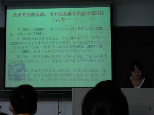 团日活动首先在一曲激扬的《走进新时代》中拉开了序幕,在班委的引导下我们一起重温了历史,回顾了改革开放三十年中发生的翻天覆地的变化,大到我国国际地位的提高、综合国力的强盛,小到人们衣食住行的变化,并观看了一些视频资料。各寝室分别派代表上台演讲,有通过三十年来影视方面的变化向我们生动呈现了改革开放后人民精神生活的丰富;有从三十年教育改革的角度阐释了教育的飞速发展提高了国民素质和核心竞争力这一观点;还有讲述三十年来百姓生活及流行乐坛发生的变化等。同学们还通过《明天会更好》这首歌对我国改革开放事业表示了最坚定的信念,寄予了最真挚的祝福。