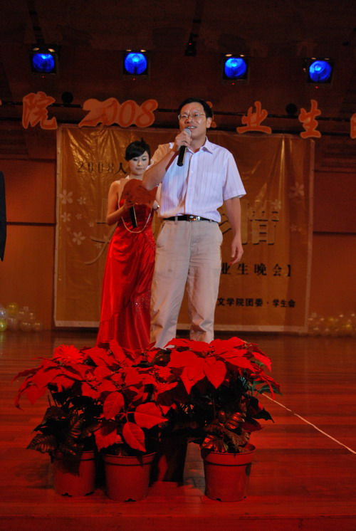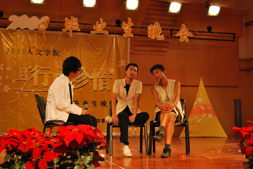 在的开场舞《Toc Toc Toc》动感十足的音乐和舞蹈中,本次晚会拉开了序幕。晚会分为走进校园、美丽成长和离别珍重三个部分。节目种类繁多,内容丰富,为在场的观众呈现上了一份视听盛宴。即将离校的大四员工则用自己十分的才情和对母校深切的情谊为这个离别的季节留下了最美的风景。张夏和辛颖这对老搭档为大家献上了一曲《老爹》,赢得了全场的掌声。而各届毕业生齐聚的《相聚2008》则将晚会推到了高潮。对于即将离校的员工,老师心中总是充满了不舍。因此毕业班的班主任们为大家带来了诗朗诵《生别离》《我希望》深深地打动了在场的观众。