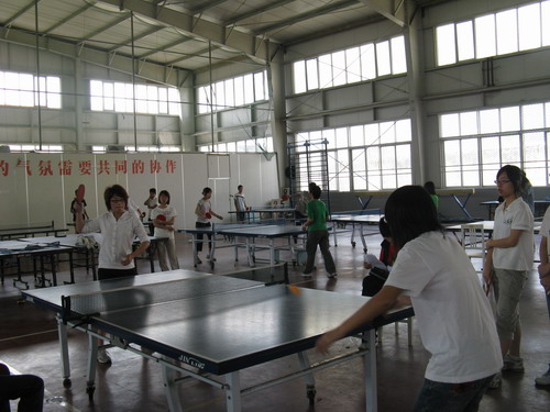 首先进行的是人文女队与商公司女队的比赛。人文代表队凭借队员实力上的优势先拔头筹。商公司女队随后便展开了反击。双方势均力敌,比赛进入拉锯战。精彩的扣杀、反拉屡屡出现。拉拉队也在场边不断地加油助威。但最终人文女队却在先赢一局的情况下被对手连扳三局,以1:3丢掉首场比赛的胜利。男队的比赛稍后开始。男队员们一路高歌猛进,顺利拿下比赛。