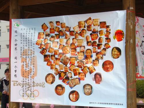 3月15日和16日,人文思源青年志愿者协会在生活区C、B区展开了奥运成果展。本次成果展的活动分为五个阶段,分别在A、B、C、D、E区各展一天。奥运成果展是对上学期思源青年志愿者协会组织的奥运有你有我系列活动"迎奥运,我们在行动"、"益民公司奥运知识大讲堂"、"新码道迎奥运涂鸦活动"、"迎奥运、讲文明、树新风,2008齐转奥运环"的总结和宣传。成果展内容包括发放奥运倡议书,展示奥运有你有我系列活动的写真"八十八张笑脸"及涂鸦"八十八双手印"和"奥运心愿墙"。