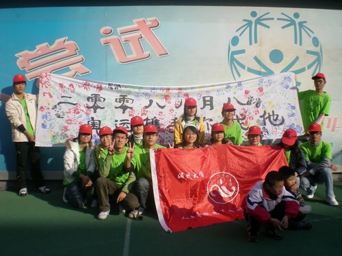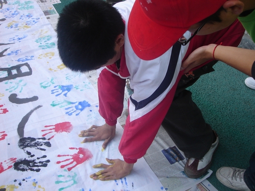 中午,大家匆忙地解决午餐踏上了去新码道的路程。新码道的师生们对我们的活动积极配合支持,在我们到来之前就在操场上排好了队耐心地等待着。在我们到达新码道之后,我们就紧罗密鼓的开始了我们的活动。本次活动我们拍下了八十八位孩子的笑脸,孩子们的笑脸阳光灿烂,无比纯真可爱,充满了对08奥运的祝福。接着,我们把八十八位小员工分为4组,由于这些孩子都是智障儿童,我们安排志愿者带领着孩子用奥运五环的五种颜色在早就准备好的白布上印上自己的手印,这个活动孩子们热情高涨,气氛活跃,用自己的双手来支持北京奥运。再接下来,孩子们在我们带去的小纸条上写下了自己对北京奥运的祝福。