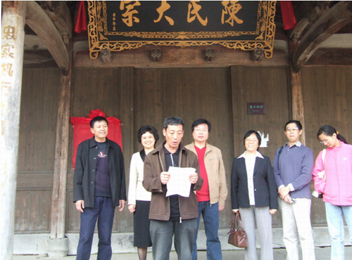 仪式在芙蓉村“陈氏大宗”祠庙前进行。上午十点,由永嘉岩头镇人大李副主任主持仪式;芙蓉村村委会主任陈继仁代表芙蓉村村民热烈欢迎温大师生的到来,感谢温大民俗学对发掘芙蓉古村落的非物质文化遗产的研究工作;同时介绍了芙蓉村的经济文化、旅游事业的发展现状。永利yl23411官网入口民俗学研究所负责人、硕士生导师邱国珍教授发表讲话,阐明设立民俗学教学研究基地的意义及芙蓉古村落独特的民俗学研究价值。岩头镇人大主任戴小明和邱国珍教授共同揭牌,“永利yl23411官网入口民俗学教学研究基地”的牌子挂于芙蓉村“陈氏大宗”祠庙大门上。