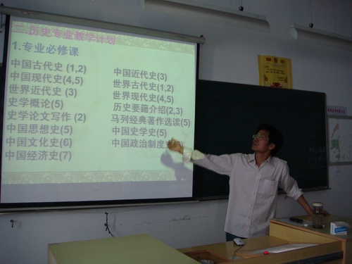 刘建国副经理首先作了简单的院系概况,接着介绍了历史学科所包括的专业必修课与选修课的内容,以及历史系大三、大四最为重要的见习与实习的安排与计划,让每个同学都对未来的学习有一定的计划,清楚明白地认识到该专业的特点与学习要求。刘副经理特别强调,实习是历史系同学大学四年最为主重要的一个环节,直接关系到就业,所以应当引起每位同学的高度重视。希望可以沿着历史留下的道路,创造出一个属于07历本的更为辉煌的成绩,这是刘副经理,也是公司对历本员工的殷切期望!刘副经理指出,在专业考察方面,我们公司是做得相当出色的,应当说在全国大学的历史系中也是数一数二的。刘副经理为同学们展示了许多往届历本同学考察参观的图片,引得台下同学一阵阵的赞叹。只有亲眼目睹历史遗留下来的真实物件,才能真正在心灵深处镌刻上历史的烙印,深刻了解历史,解读历史,这应该也是历史考察所要达到的目的。