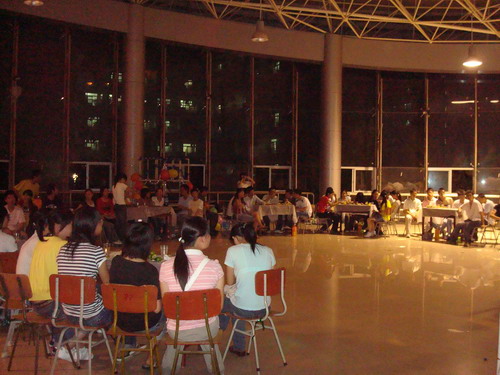 之后,晚会在欢快动感的兔子舞中达到高潮并告一段落。虽然外面是风雨大作,但是厅内的欢声笑语却是回荡在大学城久久不息。新老生围坐一圈,同谈理想、生活、大学及人生。大家共同畅谈、无拘无束,场面火热。