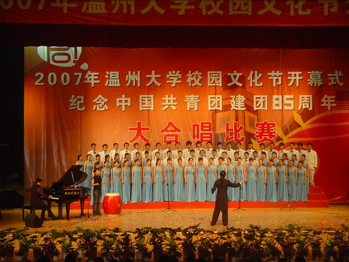 在主持人的简单介绍后,永利yl23411官网的合唱团在蔡老师的带领下第七个出场。第一首演唱的是《歌唱祖国》,宏壮有力的歌声伴随着浑厚的掌声,震撼镇在场的每一位听众。展现了他们昂扬的斗志。第二首演唱的是《谣山夜歌》,抒情的歌调,清脆悦耳的三角铁音以及整齐划一的拍掌动作,无不吸引着评委。最终永利yl23411官网以98.84的成绩勇夺一等奖。