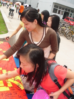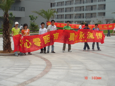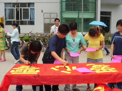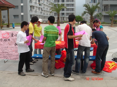 五月十二日,永利yl23411官网04中本二班团支部的同学们在C北区的活动广场开展了“爱心零距离,真情永流传”的主题团日活动。五月的骄阳炙烤着大地,但是,为了能让更多的人了解爱心超市,关注爱心超市,同学们还是选择了在中午这个人流量最多的时间段。活动中,以海报的形式向生活区的同学老师介绍了爱心超市的一些具体情况和超市目前所存在的困境,呼吁全体同学向他们伸出援助之手。本班全体同学在印有“爱心零距离,真情永流传”的爱心横幅上签名,接着我们向生活区的同学发放了宣传单,他们也在爱心横幅上签名。