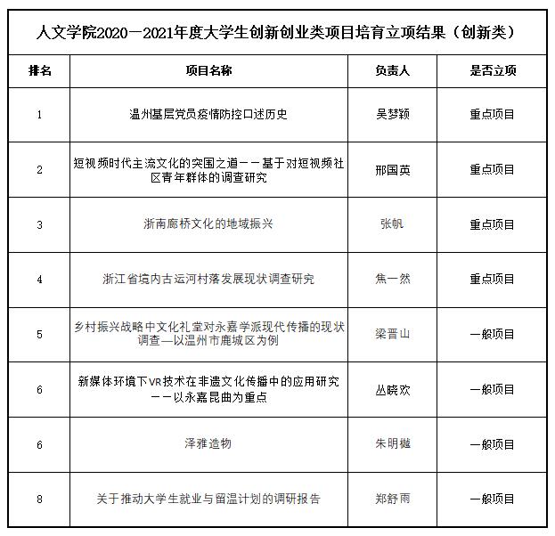 为进一步规范管理永利yl23411官网老员工创新创业类培育项目,根据《关于印发<永利yl23411官网老员工创新创业类培育项目管理办法>的通知 》[人文(2020)14号]文件要求,永利yl23411官网组织专家对各申报项目进行评审,经公示,共立项重点项目5项,一般项目5项,现将名单予以公布。