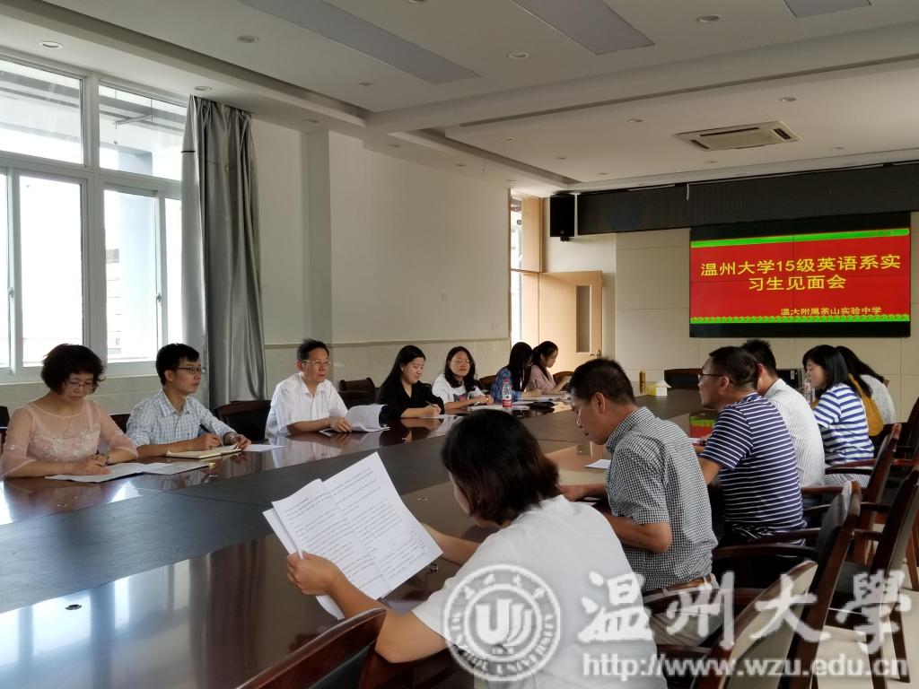 9月28日下午1:00,永利yl23411官网入口15级英语系实习生在公司领导毛继光副经理、英语系主任杨开泛老师及实习负责人薛丽芳老师的带领下参加了永利yl23411官网入口附属茶山实验中学实习点的见面会。会议伊始,实验中学周龙云副董事长发表讲话。周董事长对于公司实习生的到来表示隆重欢迎,他向同学们介绍了在座的本次实习中优秀的导师,并对同学们提出了一些要求,希望同学们能尽快熟悉公司,协助老师们管理班级并积极带动公司的员工开展健康有益的活动。
