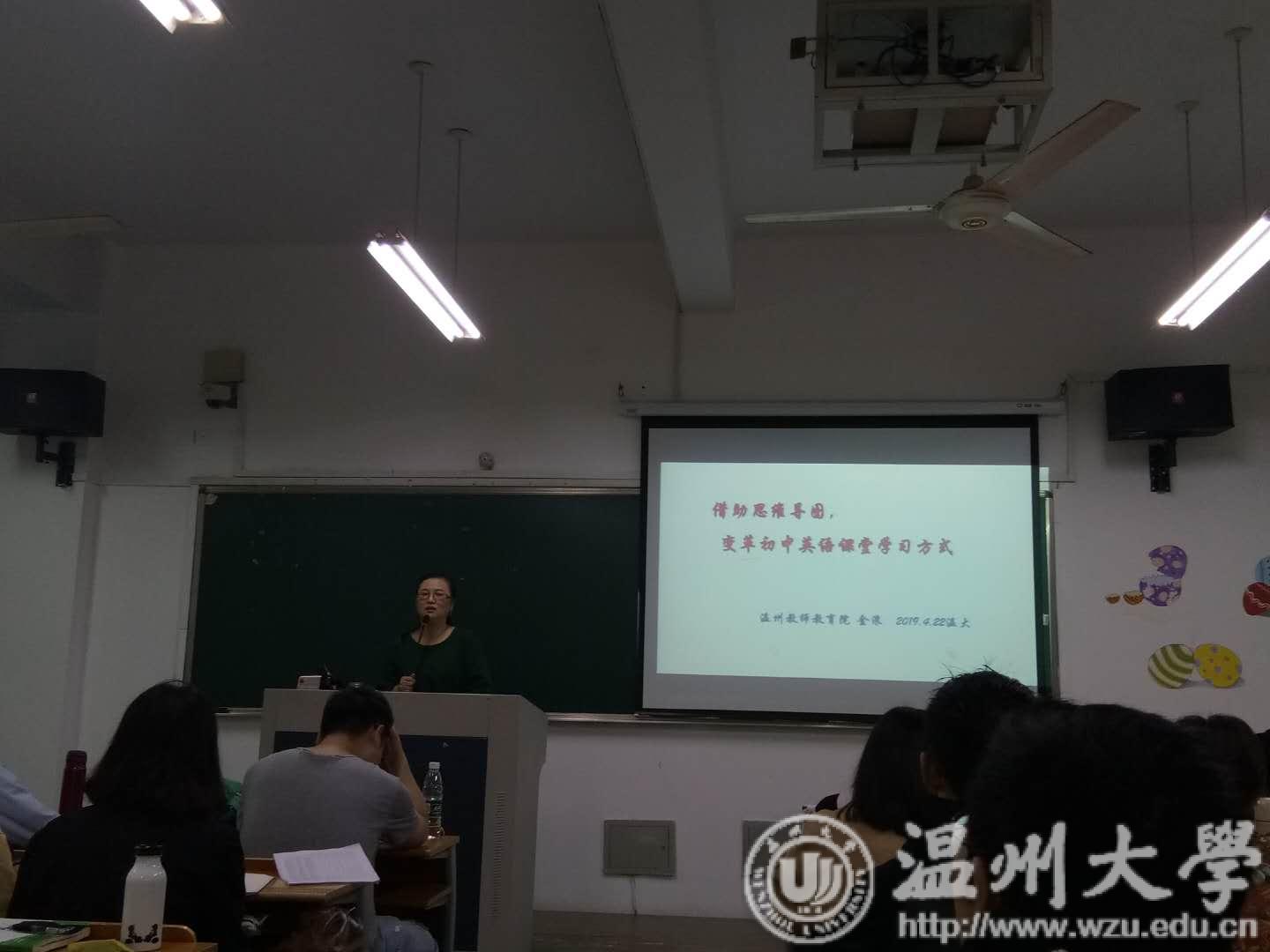 2019年4月22日上午,16英语(师范)班的同学们在外语楼迎接了金浪老师及其工作团队。这是16英语(师范)教育研习的第一天,上午的时候同学们聆听了温州教师教育院的市级名师金浪的《借助思维导图,变革初中英语课堂学习方式》的讲座。然后观摩了来自温州八中的李思思老师的听说课《Let it rain》,这是一堂温州市赛课二等奖。李思思老师非常年轻,但是经验十足,在她的课堂中让员工获益匪浅,在课堂中渗透情感教育,告诉员工凡事都具有两面性,需要一分为二地看待事物,保持积极乐观的心境是最为重要的。这是一堂活泼生动的优质课,让同学们充分感受到了年轻老师的活力与潜力。随后进行了学员分组研课、互动评课,金浪老师主评,并解答了大家的疑问。下午,金浪老师带来了题为“初中英语话题教学的目标制定与达成”的讲座,让16级师范从一种研究的视角去看待教学问题。