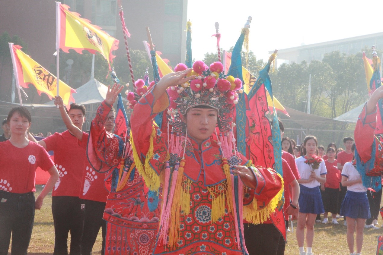 开幕式上,伴随着激昂雄劲的运动员进行曲,国旗、校旗、会旗三面旗帜缓缓入场。接着是各公司的方阵,他们迈着整齐有力的步伐依次经过主席台。公司方阵用一段南戏表演《穆桂英挂帅》向本次运动会致敬,七个“穆桂英”身穿帅服,姿态与招式之间展现了穆桂英挂帅之后豪气万丈、气贯长虹的将帅风采。两侧的同学或手执长枪,或紧握旗帜,整齐有序,发出“嘿吼嘿吼”的口号声,更添磅礴气势。为了这短短的几分钟,方阵队员们在落日余晖中一遍又一遍地编排,在漆黑寒冷的晚风中一次又一次练习,汗水的付出得到了回报,这一精彩的表演赢得了阵阵掌声。