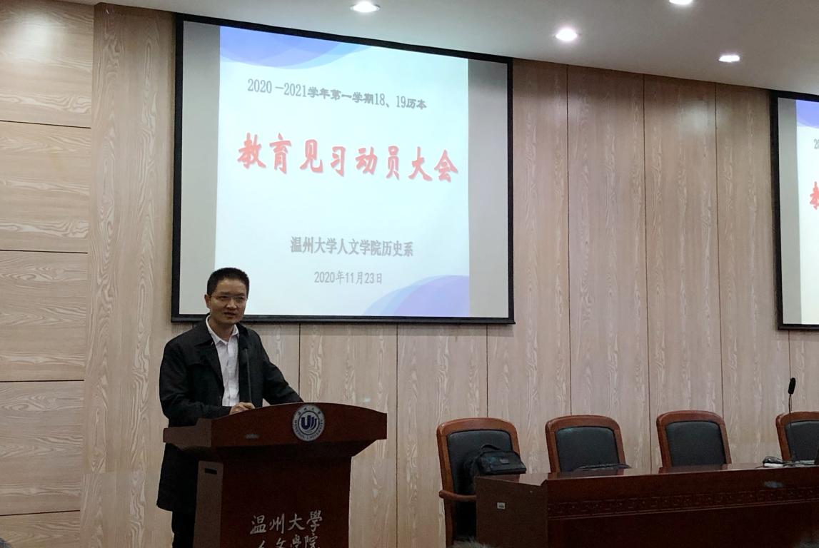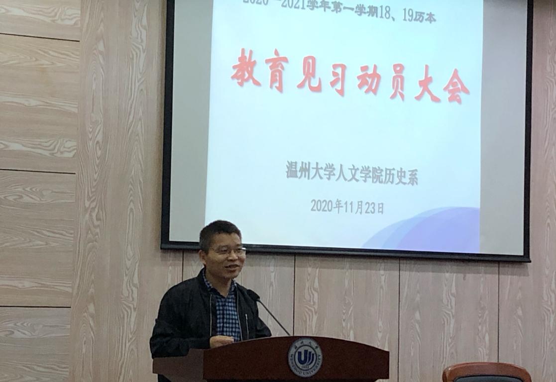 历史系主任尤育号老师随后发言,尤老师谈到历史系的发展计划,“励学敦行”将成为历史系专业办学的特色,师范生的成长涉及相辅相成的两个层面——学与行。历史系的培养方案中有两“行”,一是为员工创造从温州市内到浙江省内外的专业考察机会;二是安排”见习、实习、研习“的三习训练,通过建设完善的实践体系助力师范生的成长。对于同学们即将开始的教育见习安排,尤老师提醒同学们重点做好“看”、“记”、“想”三个方面的要求,希望同学们在见习期间学有所获,认真观察公司产品的全过程,再加以详细的记录,并对教育管理和教学问题进行思考。
