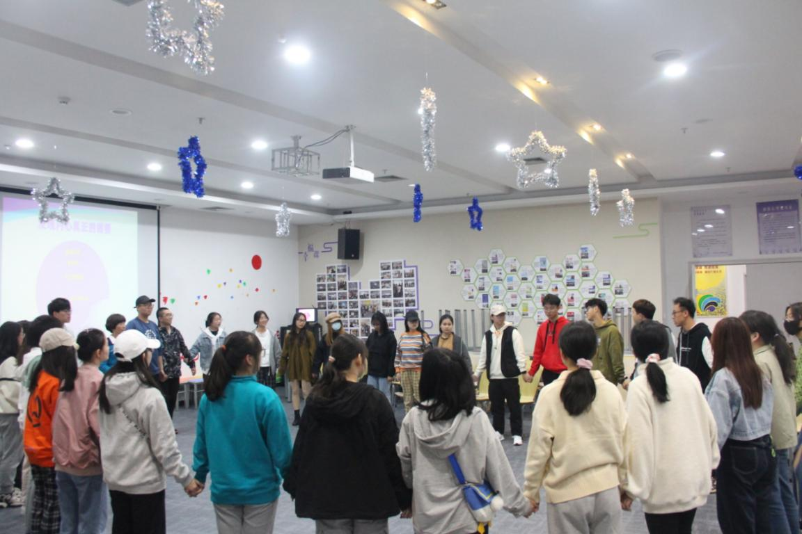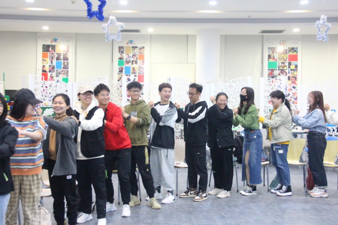 在随后进行的“心有千千结”的游戏中,同学手拉手围成一个圈,在一次次的交换位置中,同学团结一气,见招拆招回到原来的位置。对这个游戏,张老师总结到当我们在生活、学习、恋爱和人际关系中面对问题时,不应该逃避和漠视,而应该积极思考如何面对并解决。