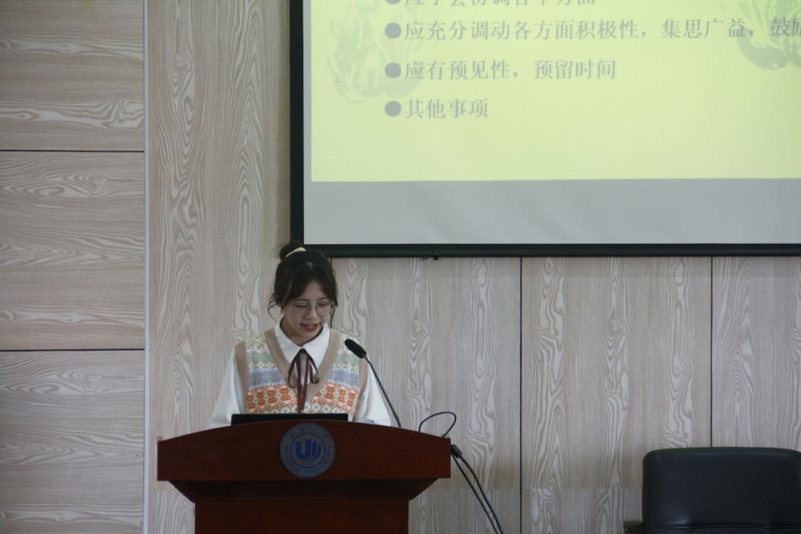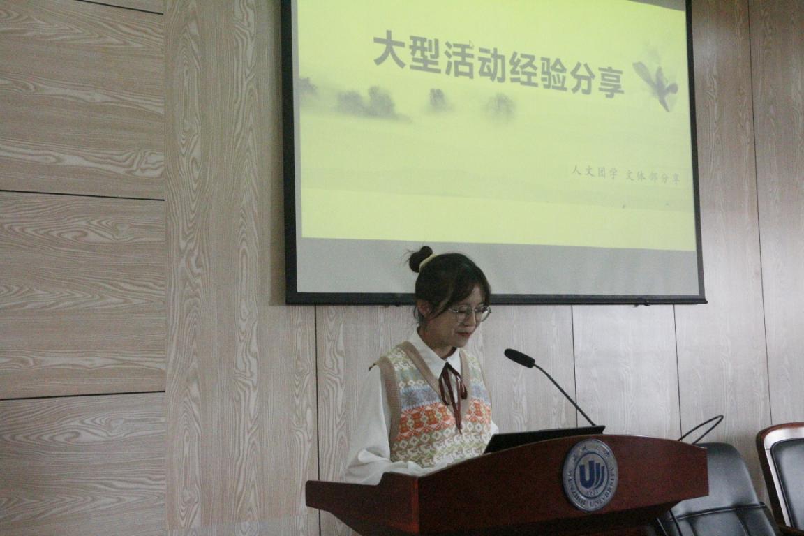 活动伊始,叶子涵发言并宣读培训班学员须知,介绍了团干培训的课程安排。随后,吴嘉沁作了以“大型活动经验分享”为主题的团干培训宣讲,从举办大型活动以及有能力举办大型活动的重要性、如何举办大型活动、举办大型活动的注意事项三个角度娓娓道来。她表示:“凡事预则立,不预则废。在举办活动的过程中会遇到意外,但重要的是去面对意外、解决意外。每位同学在日常生活与学习中也会遇到许多意外,但是大家要相信,方法总比困难多。”现场掌声雷动,每位团学干事不仅学到了关于大型活动的经验知识,也领会了遇到意外不惊惧、遇到困难不退缩的精神品格。