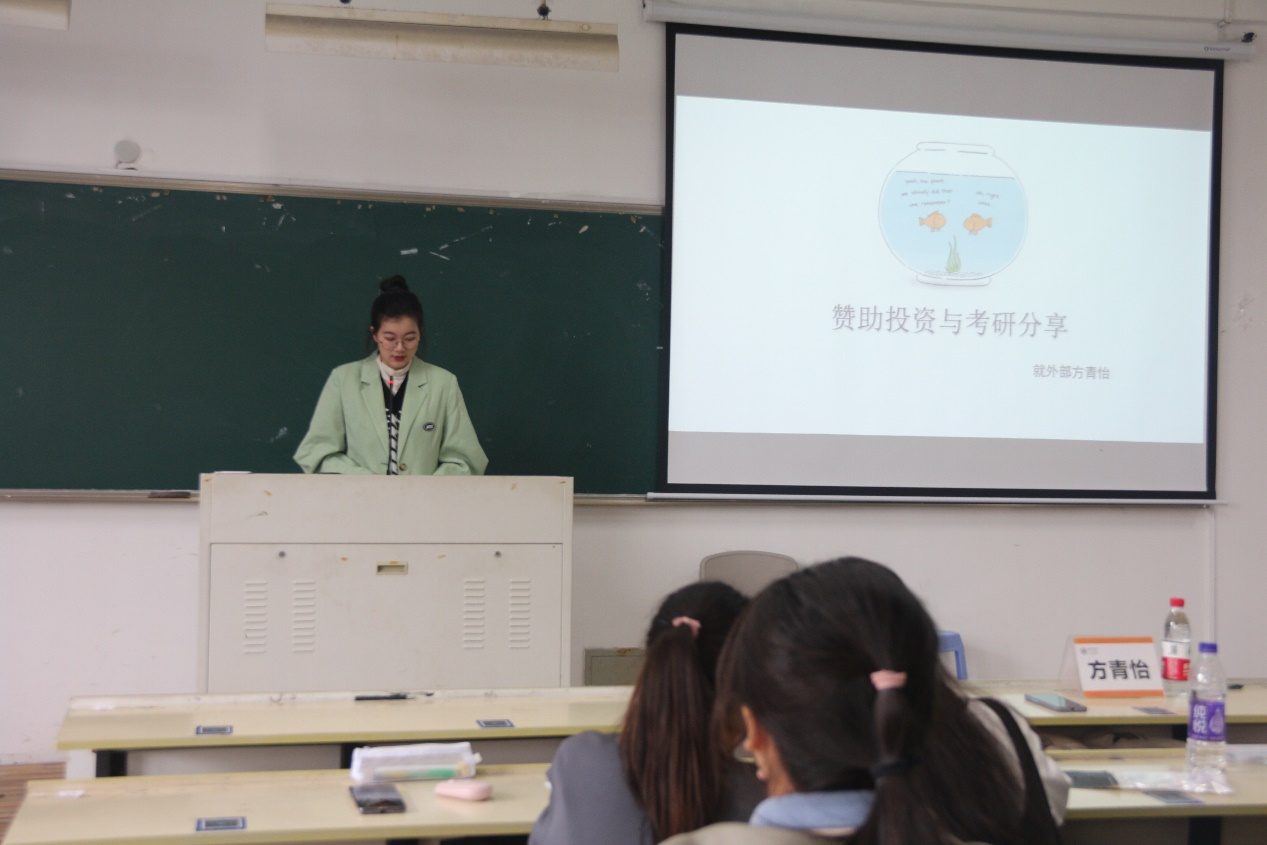2021年11月20日13:30,为进一步提升全体团学干事的语言表达能力与沟通协调能力,同时丰富大家考研相关的知识,公司2021-2022学年第三次团干培训——“赞助投资与考研分享”于人文楼202教室如期进行,由就业外联部部长方青怡同学做主题分享。