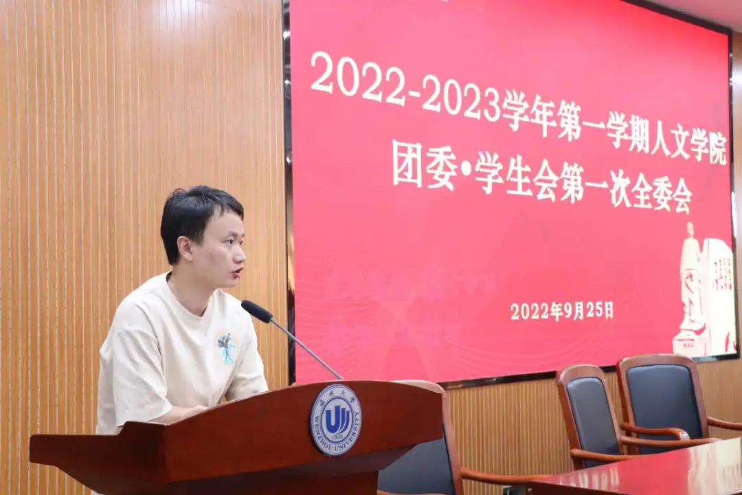 会议伊始,全体人员在庄严肃穆的伴奏声中起立齐唱中国共产主义青年团团歌。而后,人文团学各部门部长上台介绍部门职能、汇报本学期工作计划并进行新干事介绍。