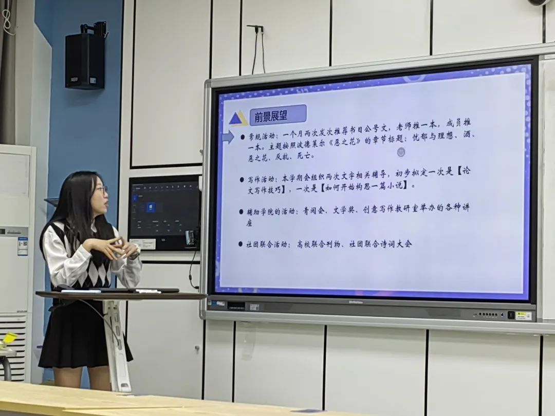 为了让新社员快速了解并融入文字作坊社,首先,社长蒋翠萍从社团简介、社团风采及社团前景展望三个方面向社员们介绍了文字作坊。