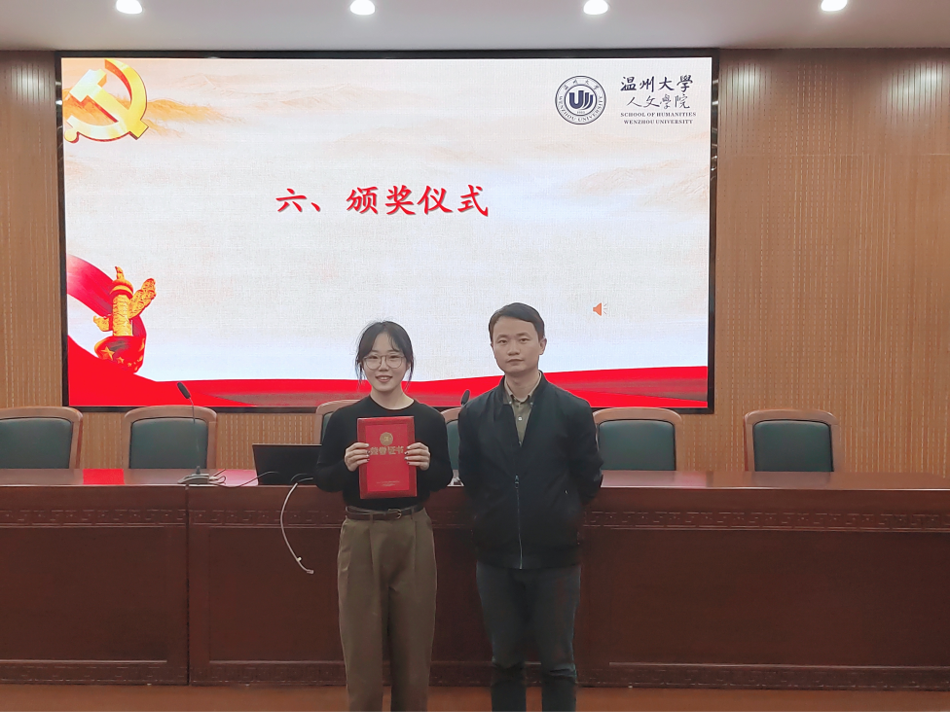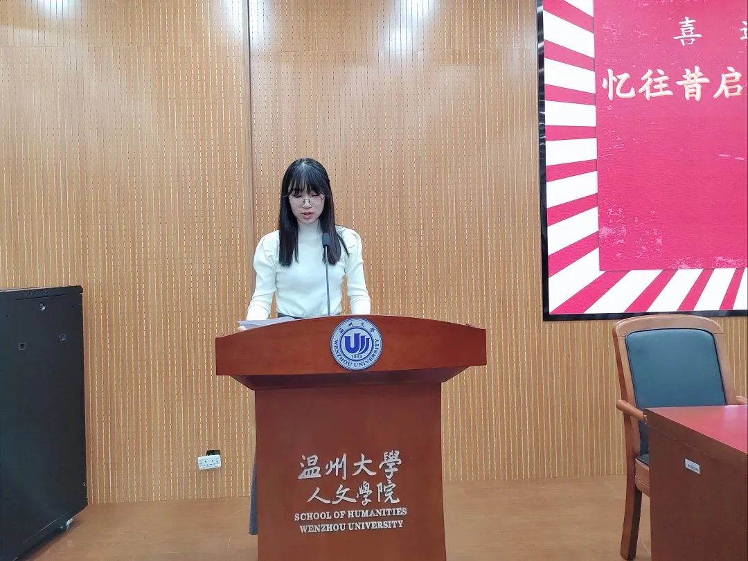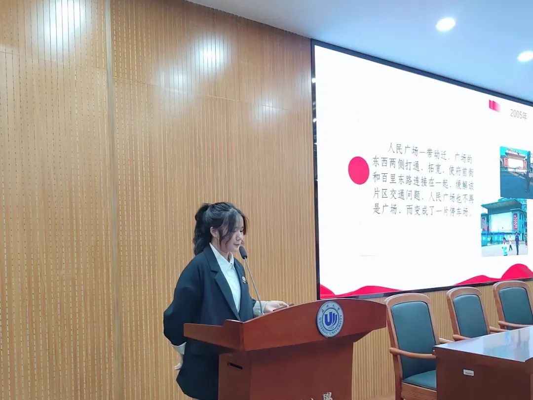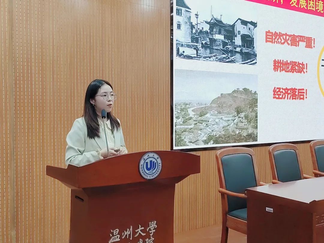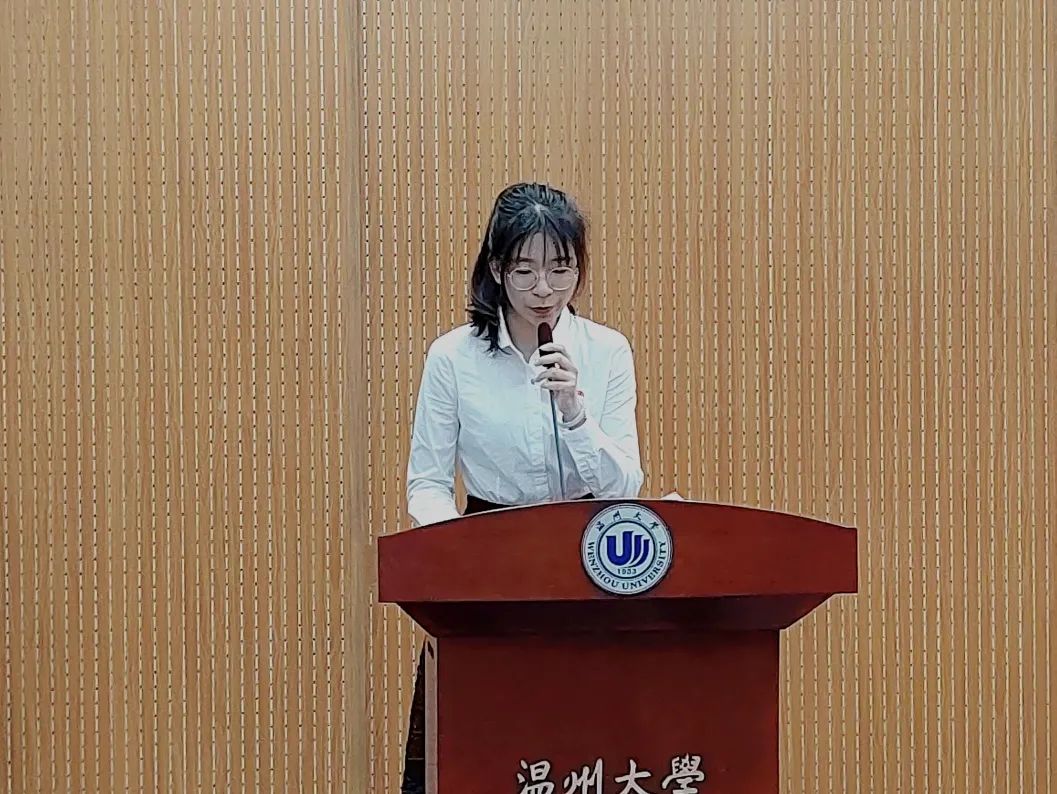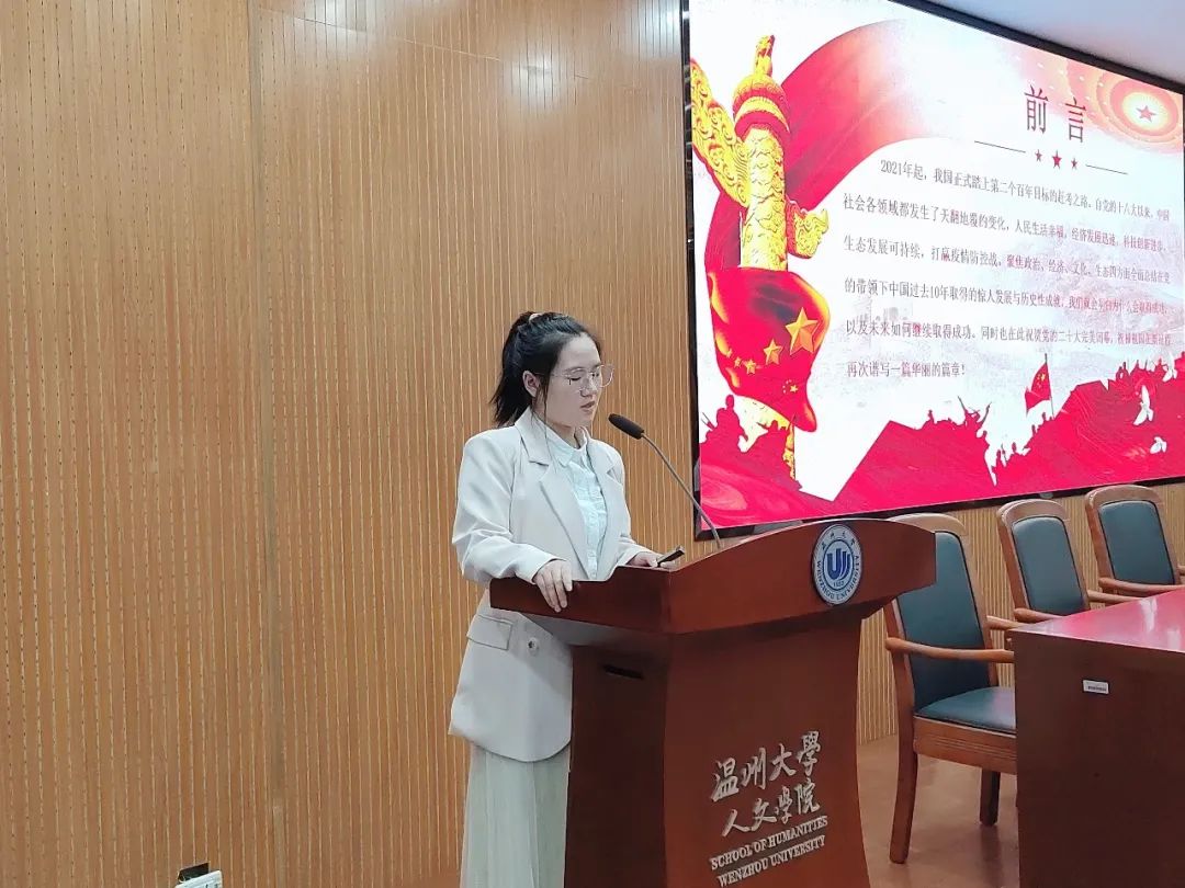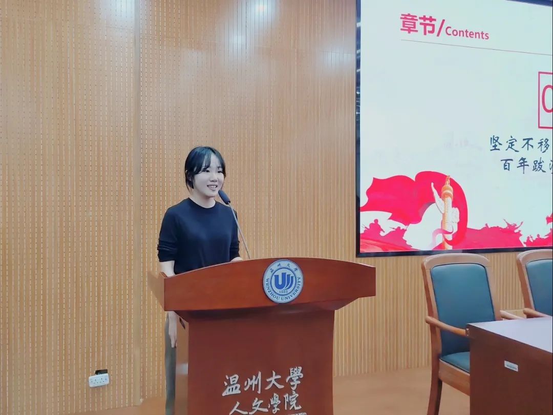 蔡雯雯同学的宣讲主题是《永不褪色的红色记忆——从温州人民广场出发》。她讲到,温州人民广场虽然已经被拆除,成为了温州人的旧记忆,但蕴藏在其中的红色记忆,依然锃亮。一代又一代的温州人,在瓯越大地上留下了深深的红色印记,让红色基因流淌进了温州人的精神血脉当中。温州的红色精神也指引和鼓舞温州人民在社会主义建设的前进道路上,不断战胜一个又一个困难,奋力夺取一个又一个胜利。