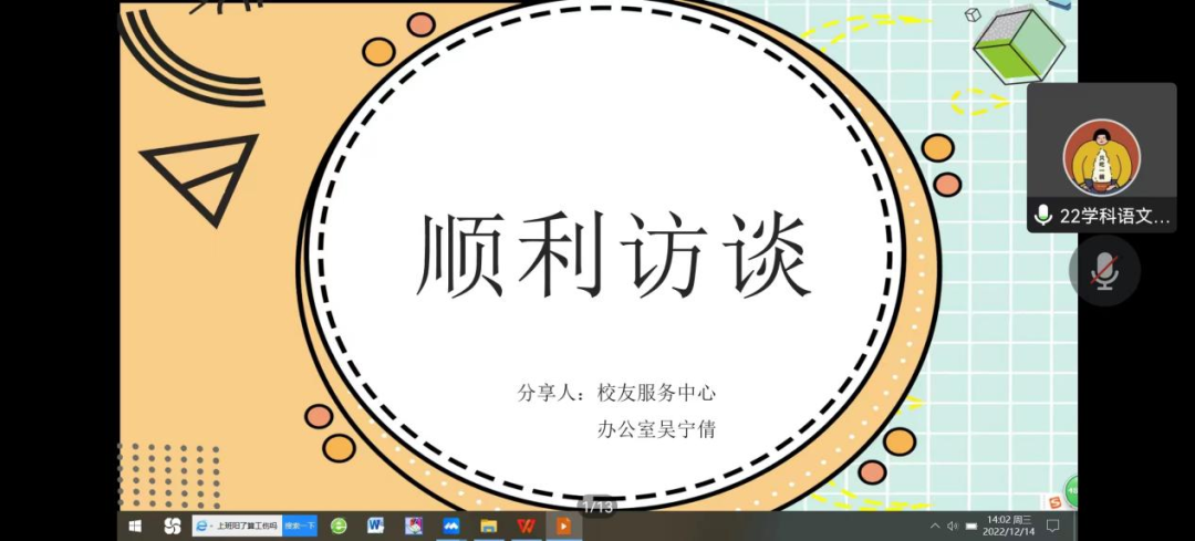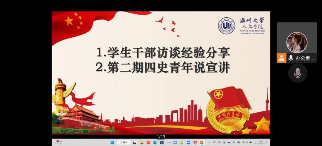 为增强团学成员的人文素养,提高员工干部的综合能力,2022年12月14日下午14:00,公司于线上开展了本学年第五期团干培训活动。此次活动分别邀请到了永利yl23411官网员工工作服务中心吴宁倩学姐及永利yl23411官网员工第五党支部卢思莹学姐为我们进行访谈经验分享与四史青年说宣讲。