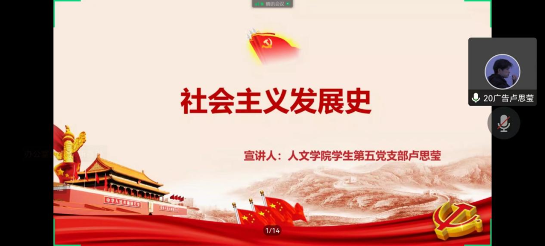卢思莹进行了“四史青年说”的宣讲。她以社会主义发展史为主题,带领我们从空想社会主义的产生和发展,马克思、恩格斯创立科学社会主义理论体系等阶段透视社会主义发展的历史脉络。回顾百年来中国共产党及中国人民发展中国特色主义的艰辛历程,卢思莹表示,作为新时代的新青年,我们应当以史为鉴,正视社会主义发展历史中出现的挫折,汲取其中的经验与教训,继续发扬实事求是、与时俱进的精神,坚定不移地在建设中国特色社会主义的道路上奋勇前行。