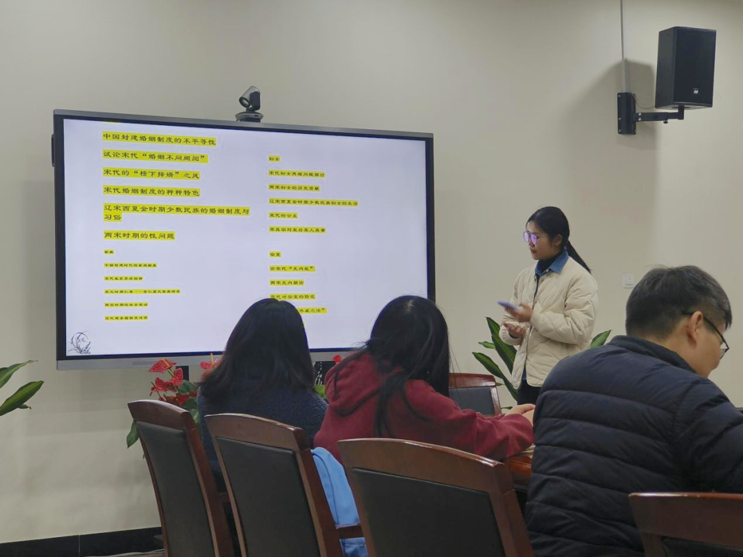 马丽君同学为大家分享的是《宋代婚姻家族史论》一书。她从婚姻、妇女、家族、宗室四个方面展开讲述。她认为本书通过唐宋对比,可以直观显示唐宋之间的社会变革。同时,此书兼顾同时期少数民族社会状况的研究。最后,马丽君同学指出本书最大的意义在于,纠正了宋代婚姻和家族的一贯看法。
