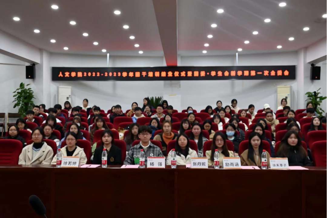 人文团学执行主席徐禾莘子、徐若婷、杨强为大家作本学期团学各部门重点工作内容及目标介绍。他们鼓励团学各部门及干事坚持不懈、努力奋斗,继续贯彻优良作风,改正不足、完善自我,朝着正确的方向不断迈进。