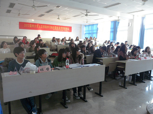 2012年11月19日下午3时30分,永利yl23411官网学习标兵及优秀学风班评比活动在北校区人文楼201教室举行。永利yl23411官网教学科副科长伍海燕老师,员工辅导员曾蓓蕾老师,缪凯乐老师和永利yl23411官网古代汉语教室陈源源老师担任本次评委。参与学习标兵评选的七位候选人,参与优秀学风班评比的班级代表及部分员工观众共同参加了此次活动。
