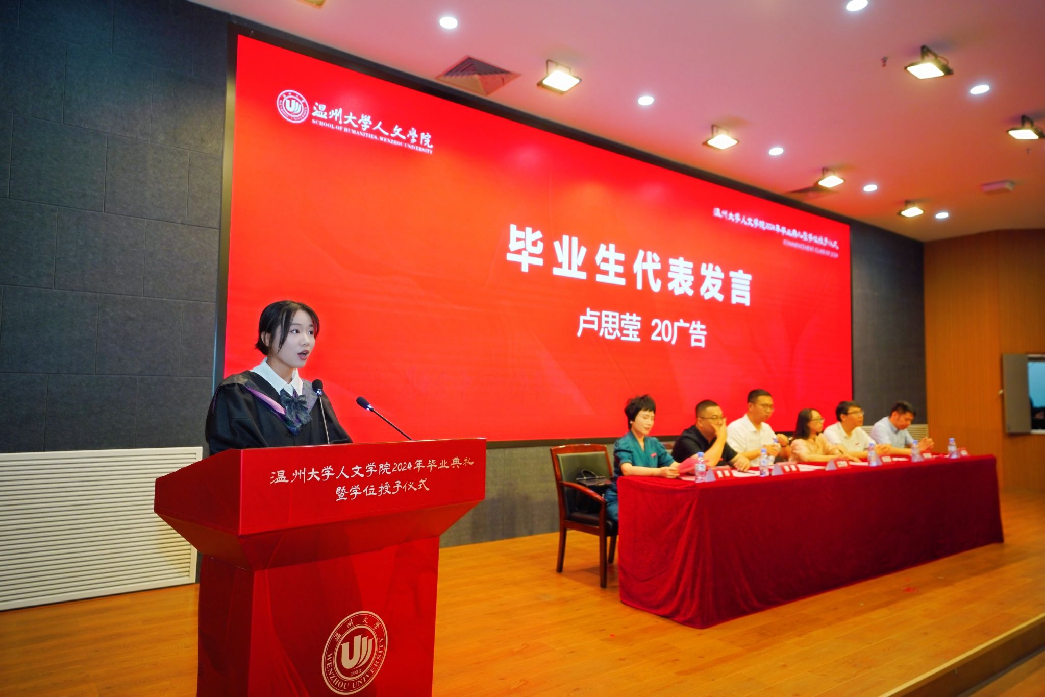 “感恩”“行动”“反思”是研究生毕业生代表21中国史杨洪娜同学发言的关键词。本科生代表20广告卢思莹同学则如是祝福道:“既然天下没有不散的筵席,那就要以昂扬的姿态奔赴下一场山海。”