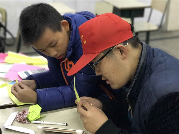 活动当天,志愿者们于8:00到达丽岙一小,开始场地布置和前期准备工作。8:20小朋友陆续到齐,志愿者们与小朋友们进行简单交流,有了初步地认识。8:30活动正式开始。首先是感恩故事分享环节,主持人讲述感恩故事,调动现场气氛,积极鼓励小朋友们感恩自己,对自己说句谢谢。随后,由志愿者给每位小朋友分发彩纸和笔,在志愿者的引导下,小朋友们在纸上写下对自己的感谢的话语。孩子们稚嫩的笔尖写出的短短话语,却令志愿者们感动不已,这个年纪的纯真最为可贵。写好后,由志愿者教小朋友们折纸。折纸形式花样百出,有象征着美好祝愿的千纸鹤,也有象征着放飞理想的纸飞机,还有美丽的花朵与可爱的兔子。在折纸过程中,小朋友与志愿者的关系也更加亲密,不少小朋友都把自己的折纸作品送给了志愿者,还主动要求要与志愿者合影。折纸环节结束后,孩子们拿出了自己带的围棋、积木等物品,邀请志愿者们一起游戏,整个环境其乐融融。活动最后,志愿者们将信封与信纸发给小朋友们,让他们写一封信《致未来的自己》,在写信过程中,现场响起了音乐《感恩的心》,志愿者与小朋友们一起,轻轻地哼着歌,写着字。音乐停止,信也写好,志愿者们与小朋友们一起,拍照留念。11:00,活动结束,志愿者们离开丽岙一小。