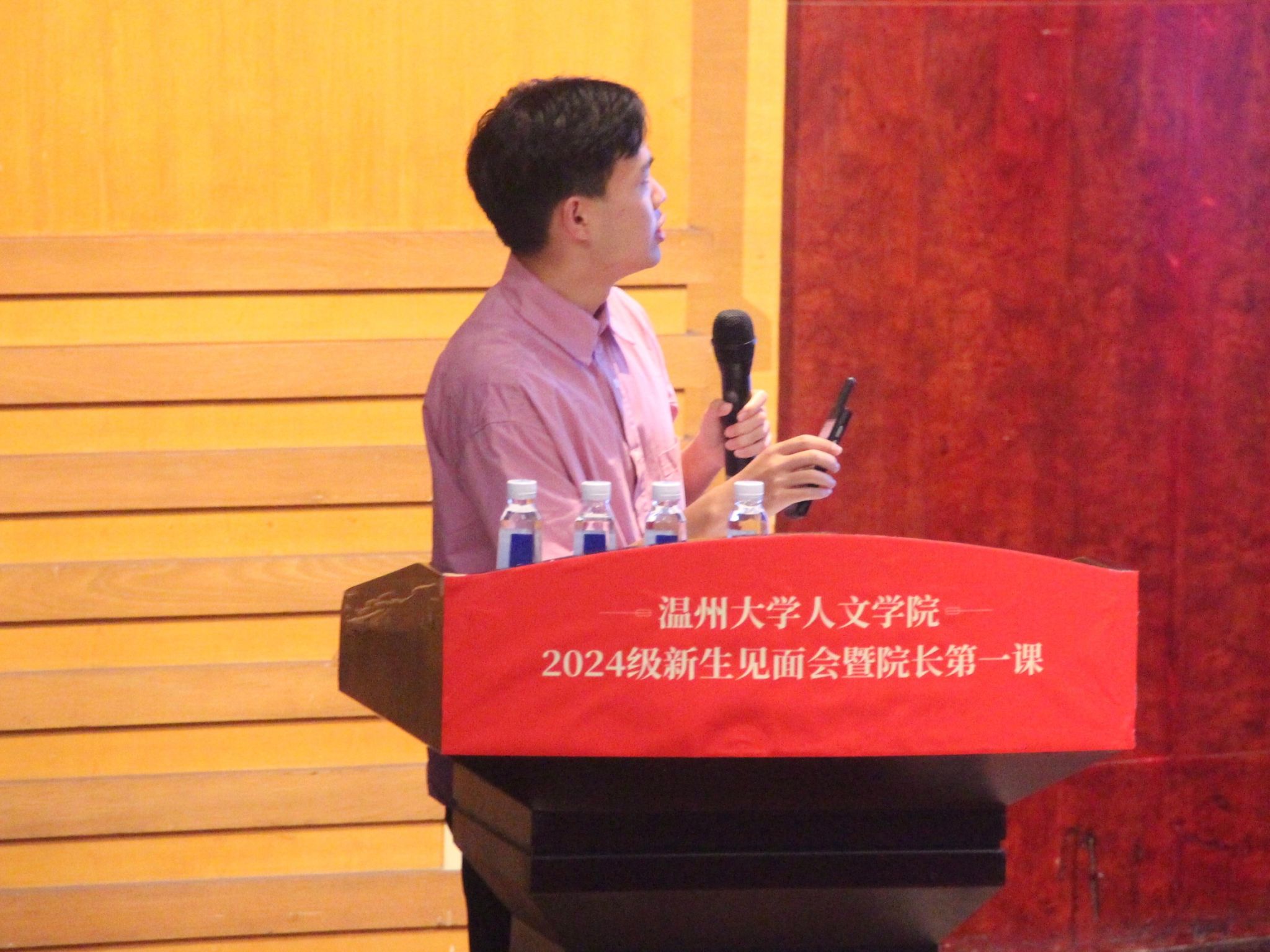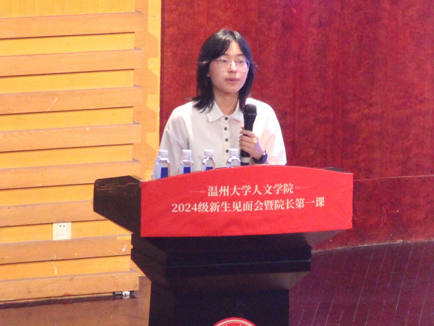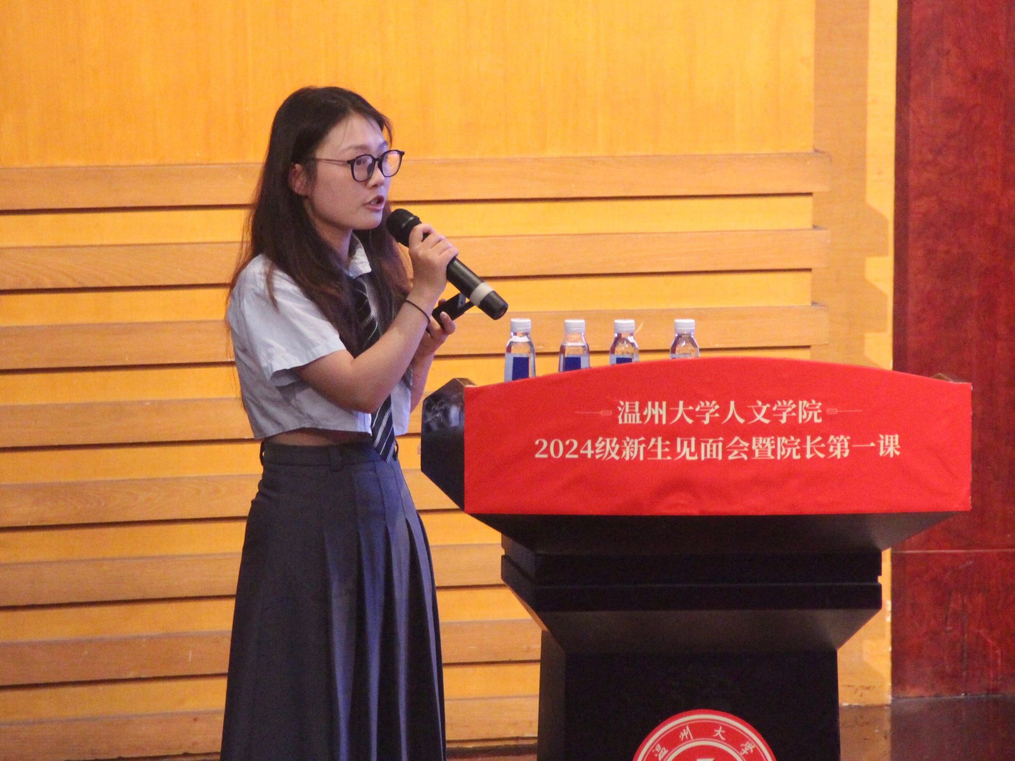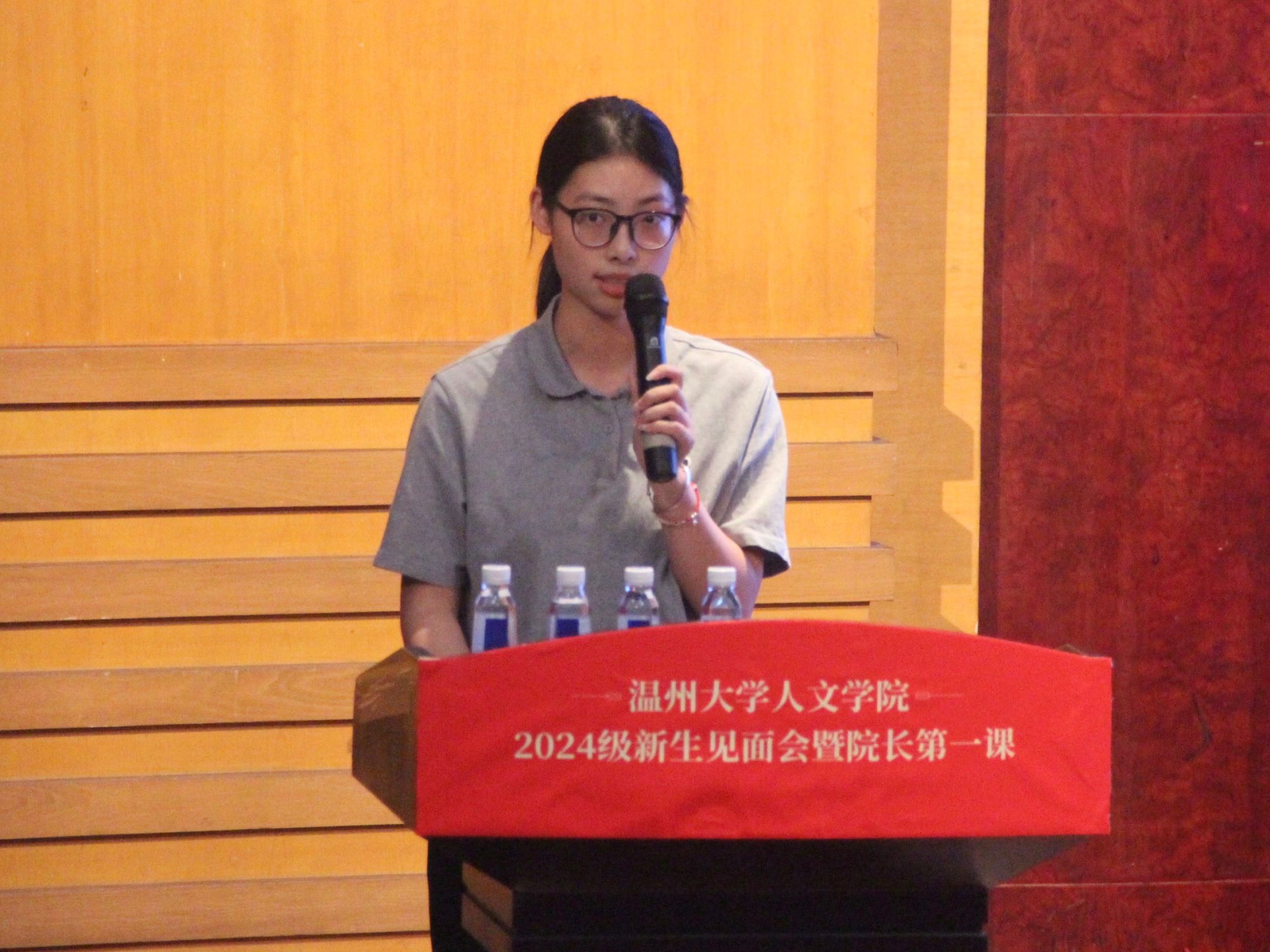 随后,班助代表董书娴带来了经验分享。她以一个温大“过来人”的身份向新生们系统又全面地介绍了各类证书、竞赛,建议新生们要尽早对学业以及各类活动进行合理规划。她介绍了温大各个学区的内部分布以及寝室事务细则,希望新生们在学业之余也要安排好寝室内务,享受老员工活。新生们在学姐的描绘下对温大的学习与生活概况有了相应的了解,对于即将启程的温大生活充满了期待。