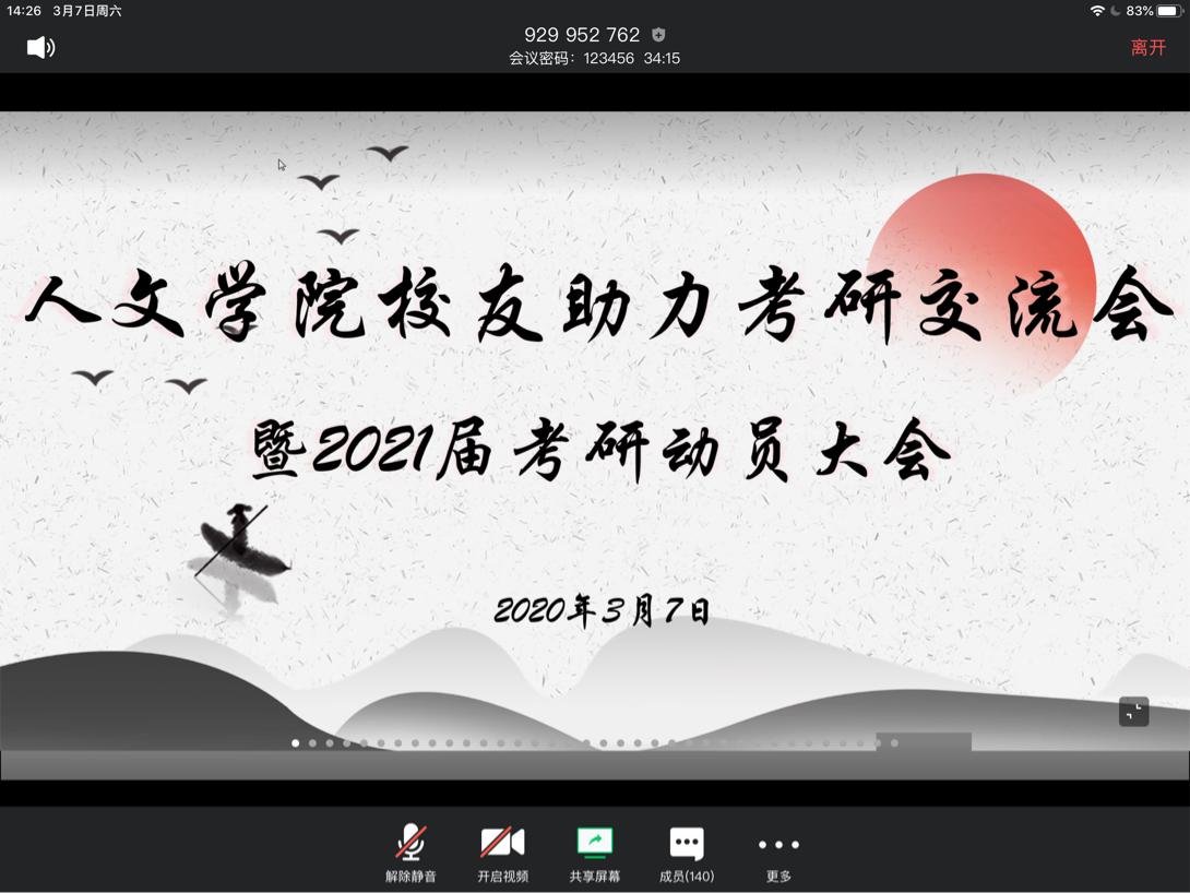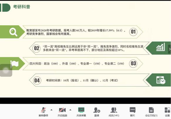2020年3月7日14:00,永利yl23411官网开展员工助力考研线上经验分享会暨2021届考研动员大会。本次分享会特意邀请来自南京大学、南京师范大学、安徽大学、上海师范大学、浙江师范大学等7位优秀员工,为我们带来丰富的考研经验和感悟。出席本次会议的有公司党委副书记魏一老师、学工办主任刘纪峰老师、学工办申业磊老师、李丹萍老师以及有考研意向的同学共140余人。