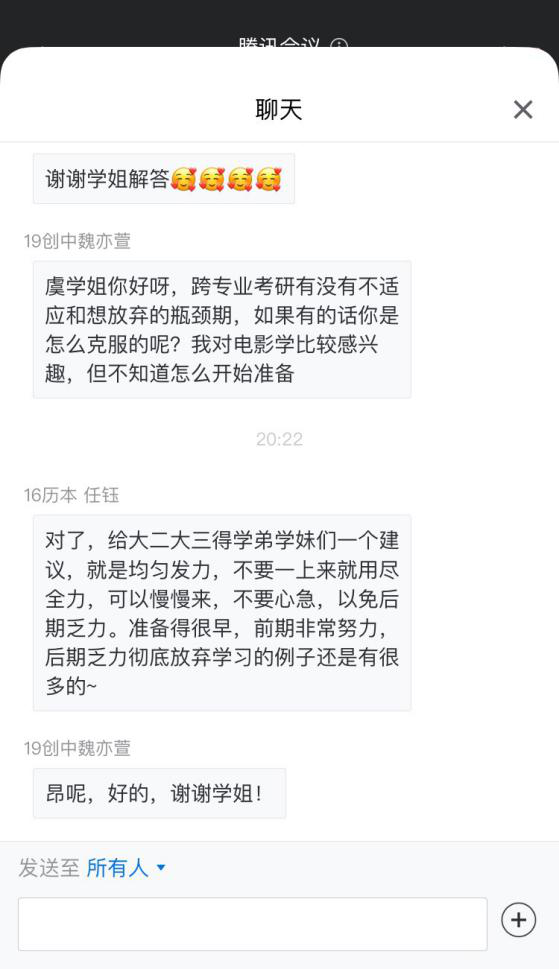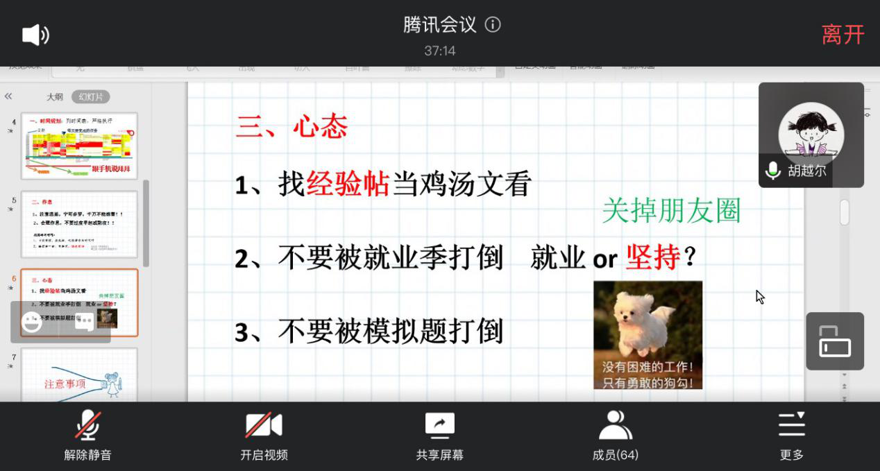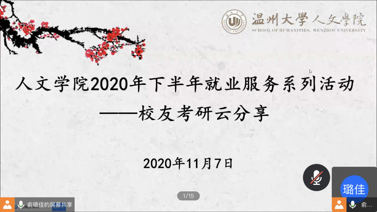 2020年11月7日晚6点30分,公司“2020年下半年就业服务系列活动之员工考研云分享”在腾讯会议上正式拉开帷幕。院学工办辅导员申业磊、李丹萍,4位优秀员工以及有考研意向的同学共60多人参加了此次分享会。