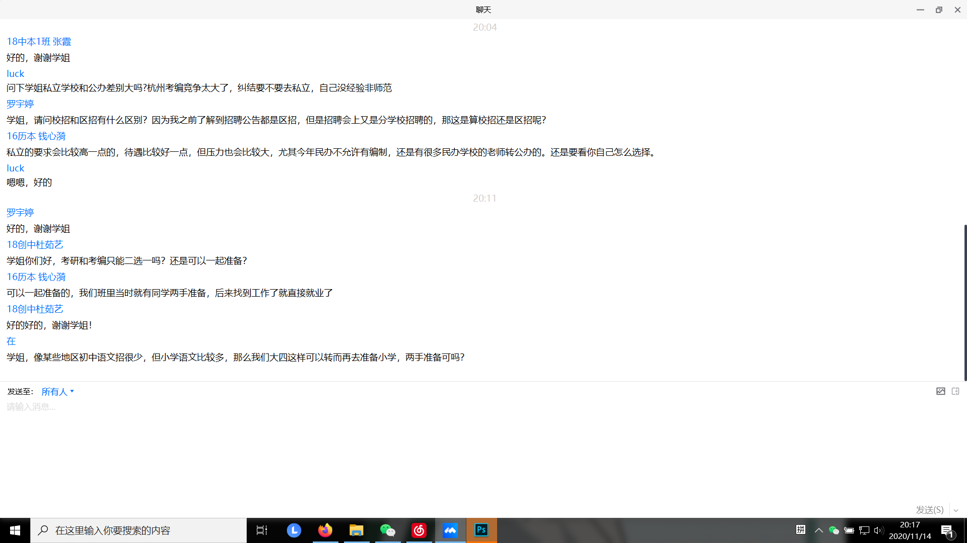 在最后的互动交流环节,员工们对同学们提出的问题进行了认真详细的解答。此次考编云分享,是公司2020年下半年就业服务的第二期系列活动,它为同学们搭建了一个与考编成功的学长学姐进行交流的桥梁,有助于同学们了解与考编相关的信息,吸取考编经验,在考编之路上走得更快更稳。