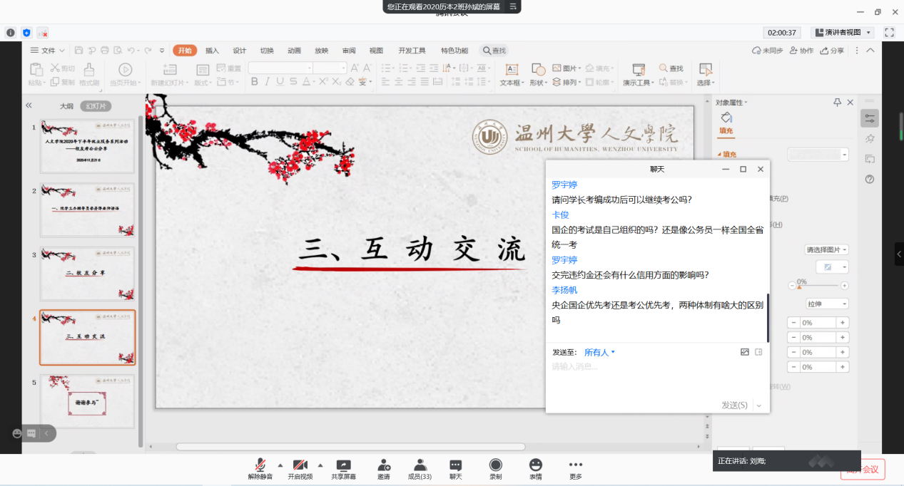 最后是互动交流环节,学长们对考公相关问题如“央企国企和考公哪个优先考”和“一般岗位报录比多少算是竞争不太激烈”等进行了一一解答。本次考公云分享,是公司2020年下半年就业服务系列活动之员工云分享的最后一期。通过分享与交流,有助于同学们找准定位,合理备考,朝着自己的梦想进发。