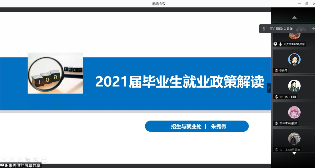 大会伊始,朱秀微老师对2021届毕业生就业政策进行解读。她以案例导入,分析了目前的就业形势,如受疫情影响仍具有不确定性、“高期望”“慢就业”加剧等。随后具体解读了国家相关的就业创业政策,她推荐同学们可以到新职业网了解相关就业信息。关于老员工就业补贴问题,朱老师分享了温州市510政策,并将浙江省各地的老员工就业补贴做对比,使同学们能够更加直观地了解。