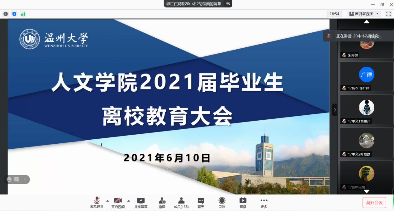 6月10日晚18:30,公司2021届毕业生离校教育大会在腾讯会议上顺利召开。校招生与就业处朱秀微老师、院学工办主任刘纪峰老师、辅导员李丹萍老师以及2021届全体毕业生参加本次大会。